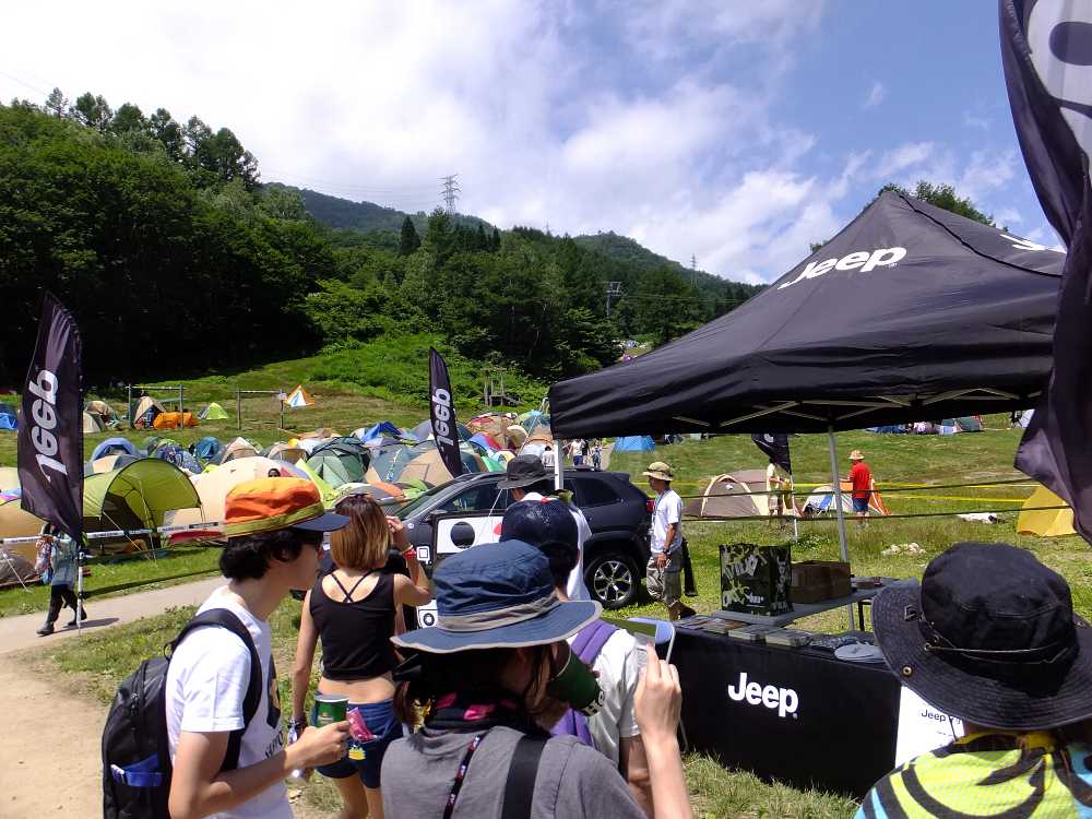 顔にジープのロゴを貼っているスタッフ。