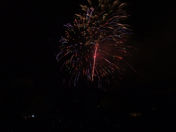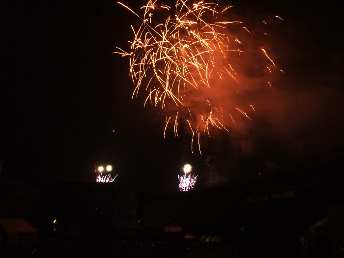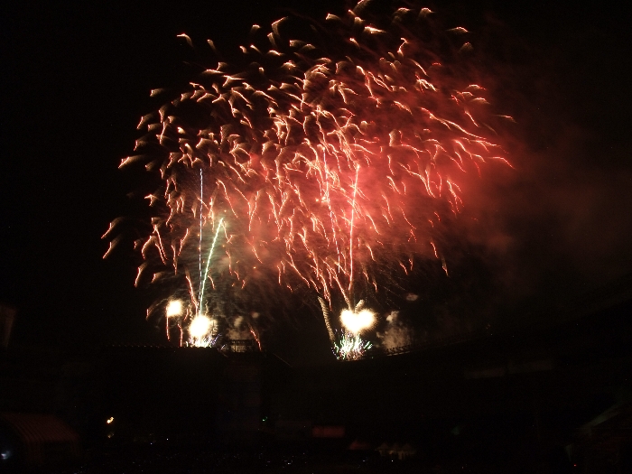 花火の下に写っている小さな光はマリンステージのモニターに映っている花火です。